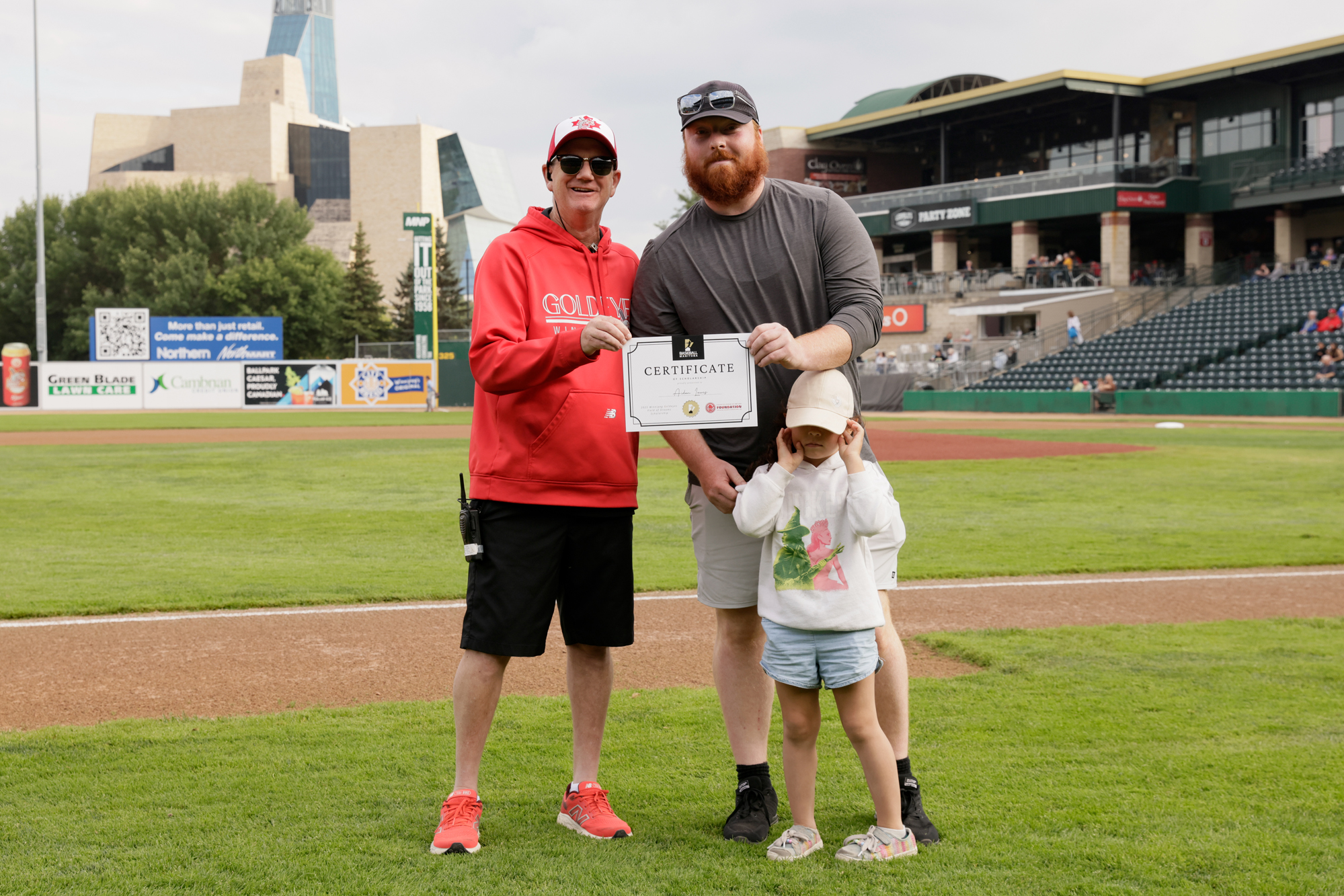 Photo left to right: Andrew Collier, GM of the Winnipeg Goldeyes; Keenan Lewis (Aiden's brother, accepting the award on his behalf), and Keenan's daughter. Photo Credit: 1812 Photography