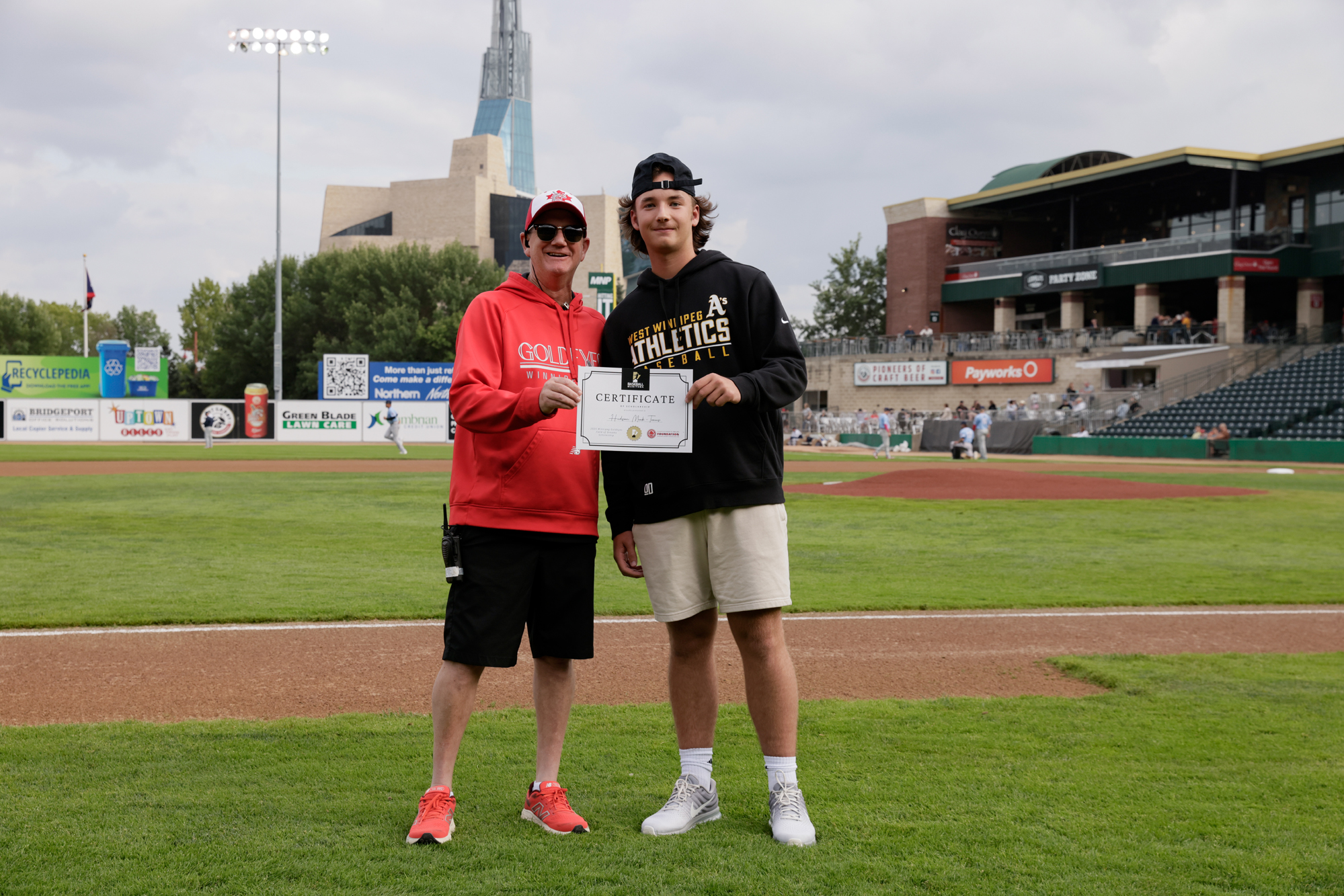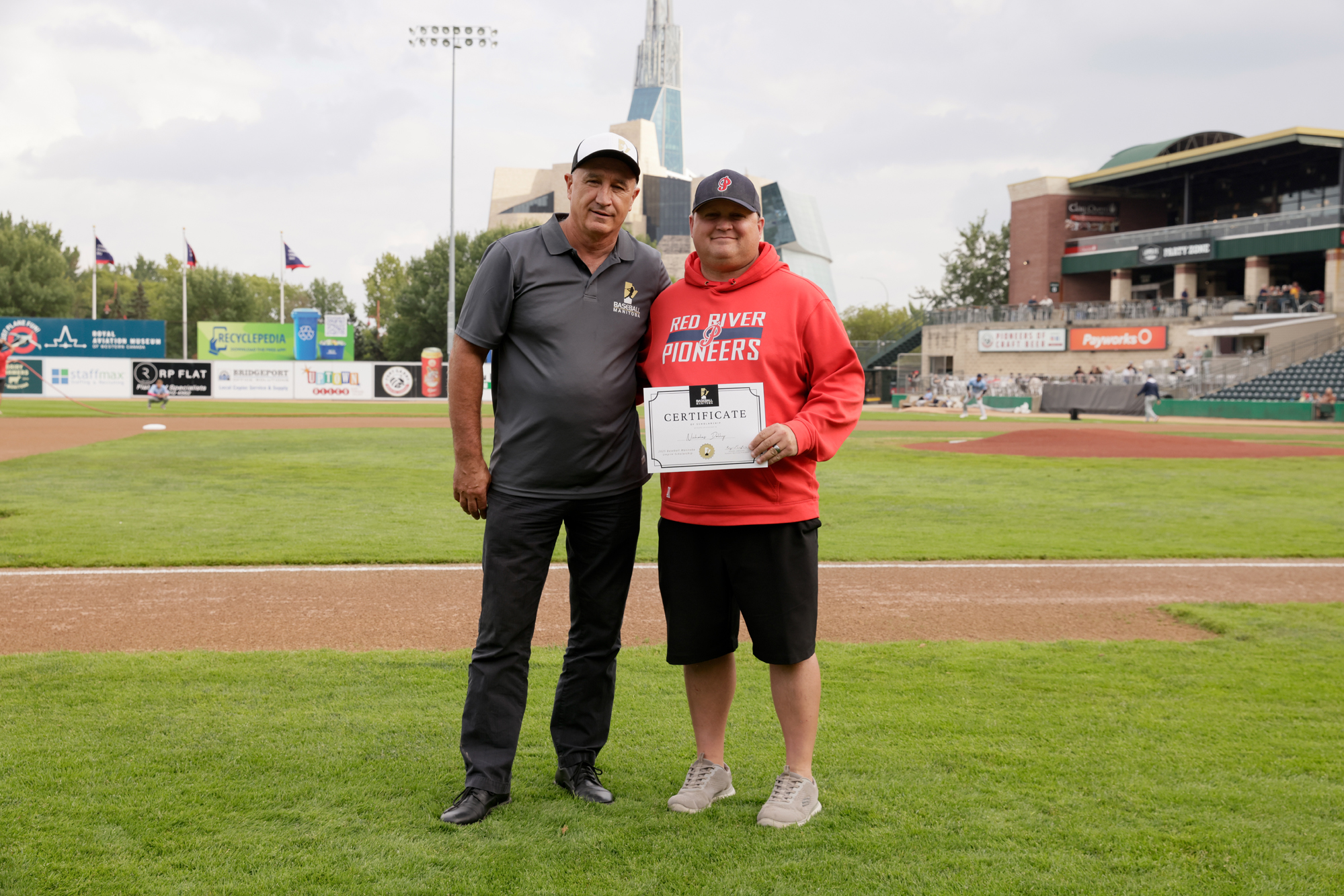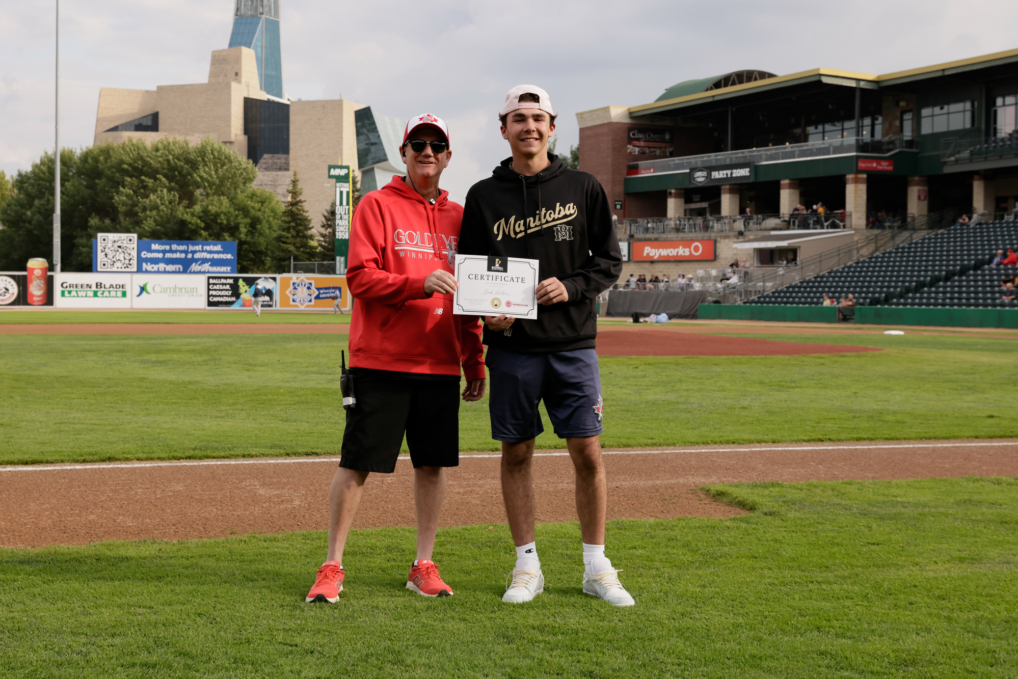 Photo left to right: Andrew Collier, GM of the Winnipeg Goldeyes; Hudson Meek-Toews. Photo Credit: 1812 Photography