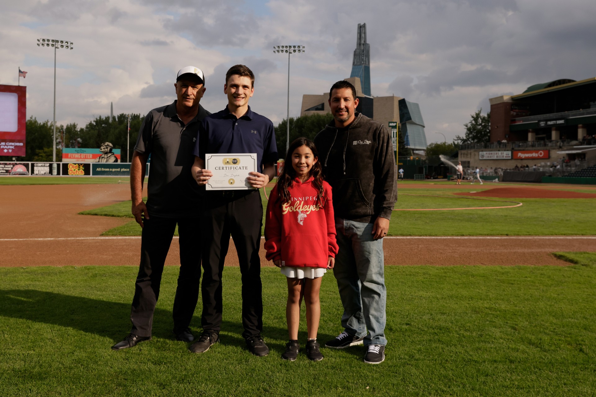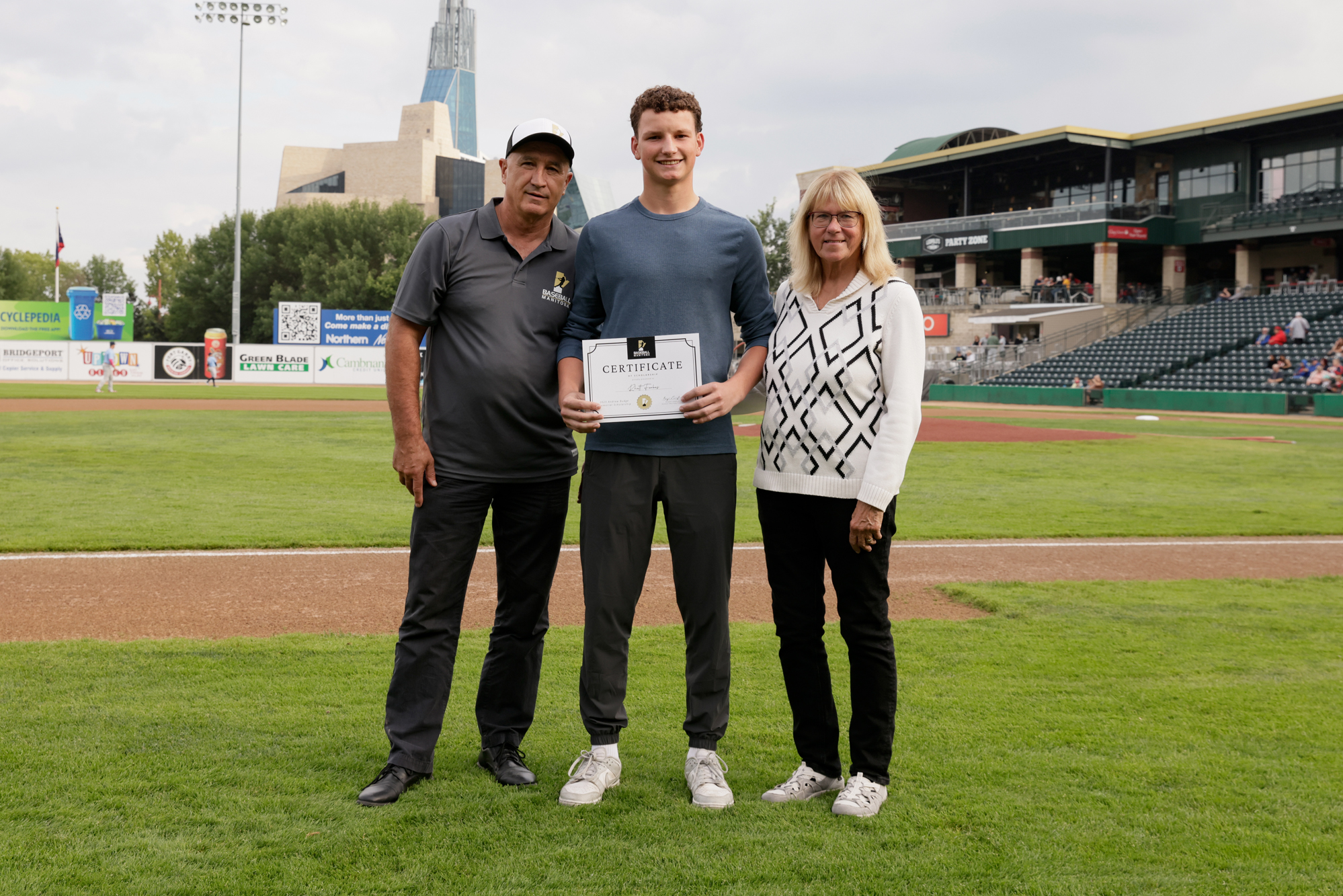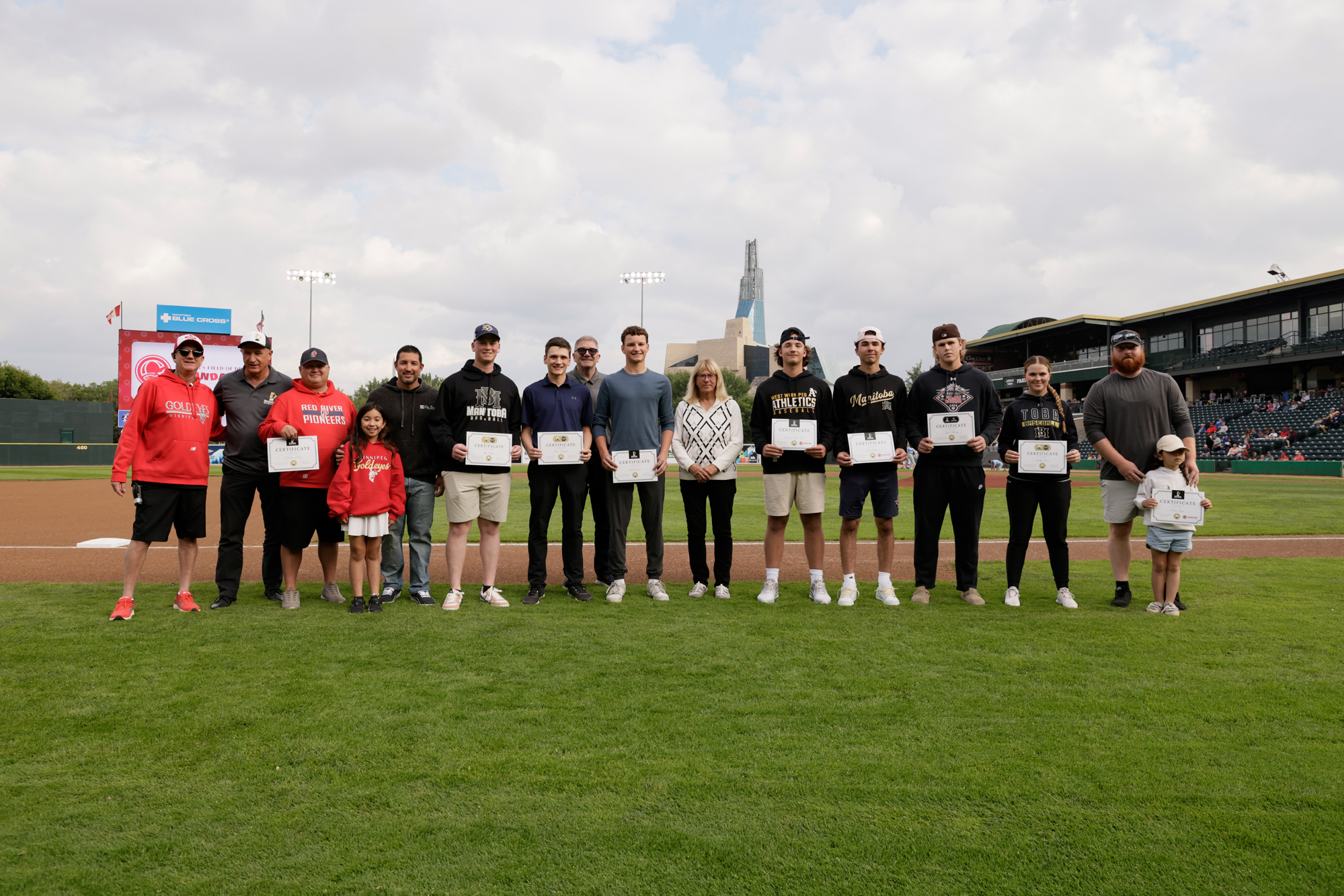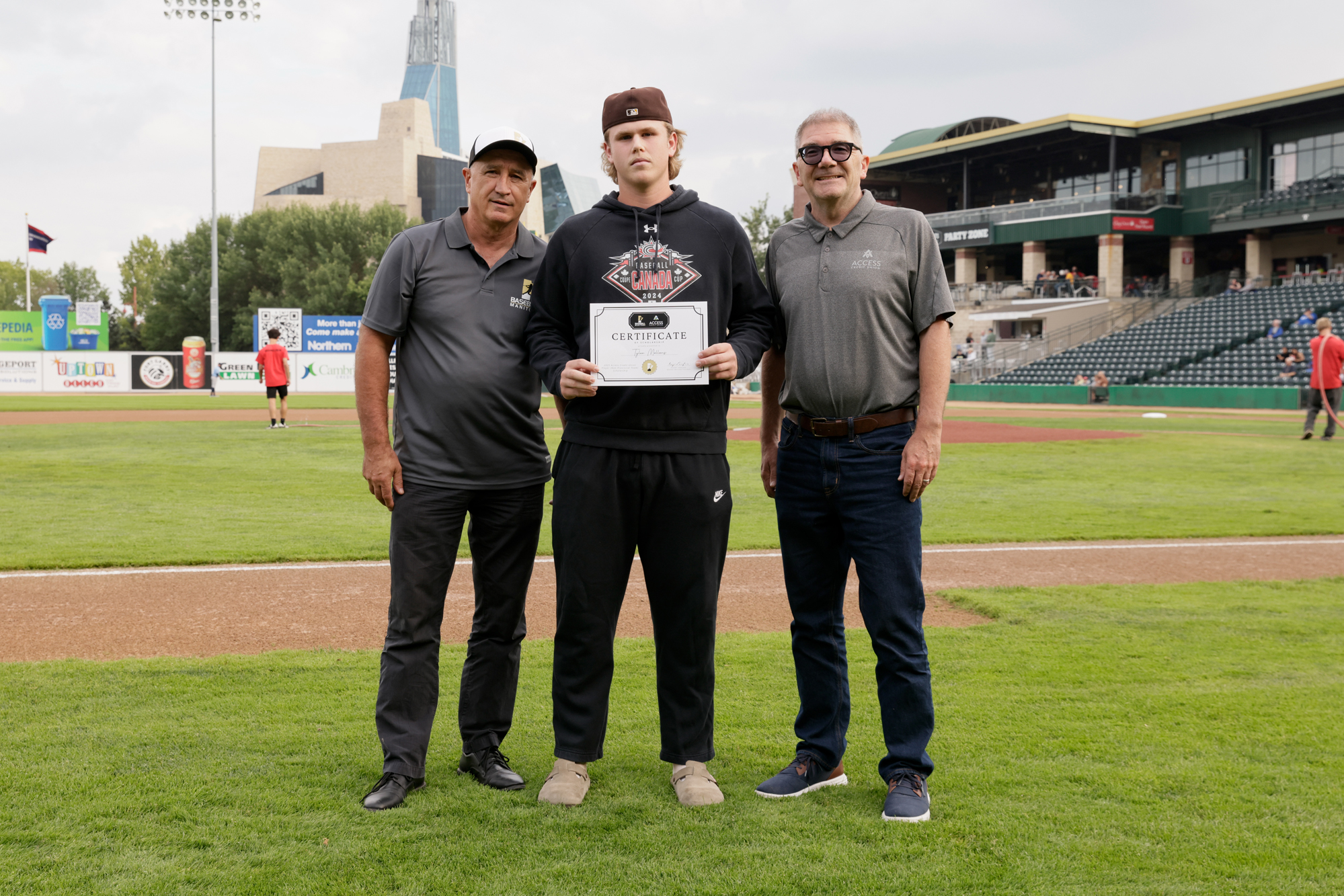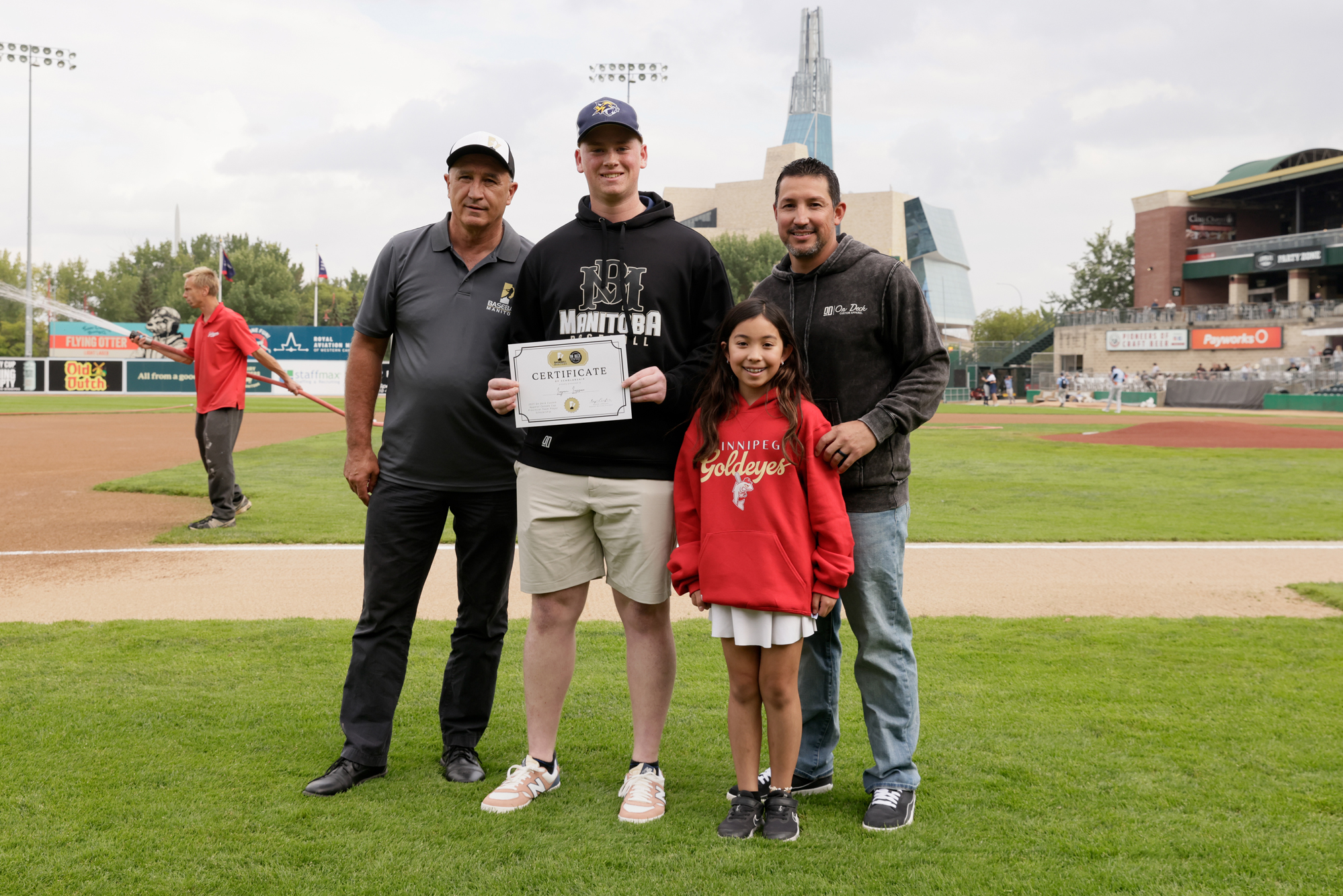 Every year, all of us at Baseball Manitoba look forward to presenting our scholarships at Blue Cross Park. Last night, five Baseball Manitoba Scholarships, the Andrew Budge Memorial Scholarship, and three Field of Dreams Scholarships were presented to all recipients before the Goldeyes faced off against the Gary Southshore Railcats.