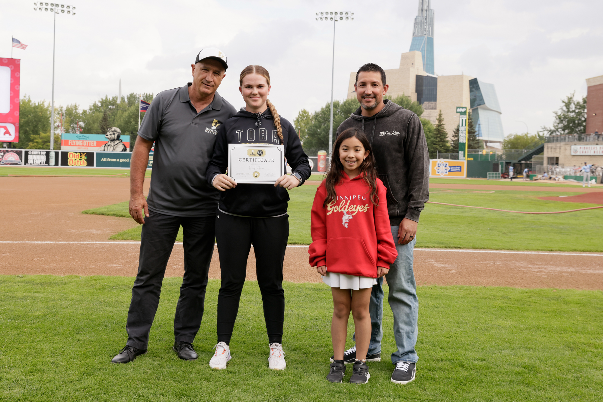 Photo left to right: Roger Langlais, Baseball Manitoba's President, Ben Baydock, Isla Ramon, Amos' daughter, Amos Ramon, owner of On Deck Custom Apparel. Photo Credit: 1812 Photography