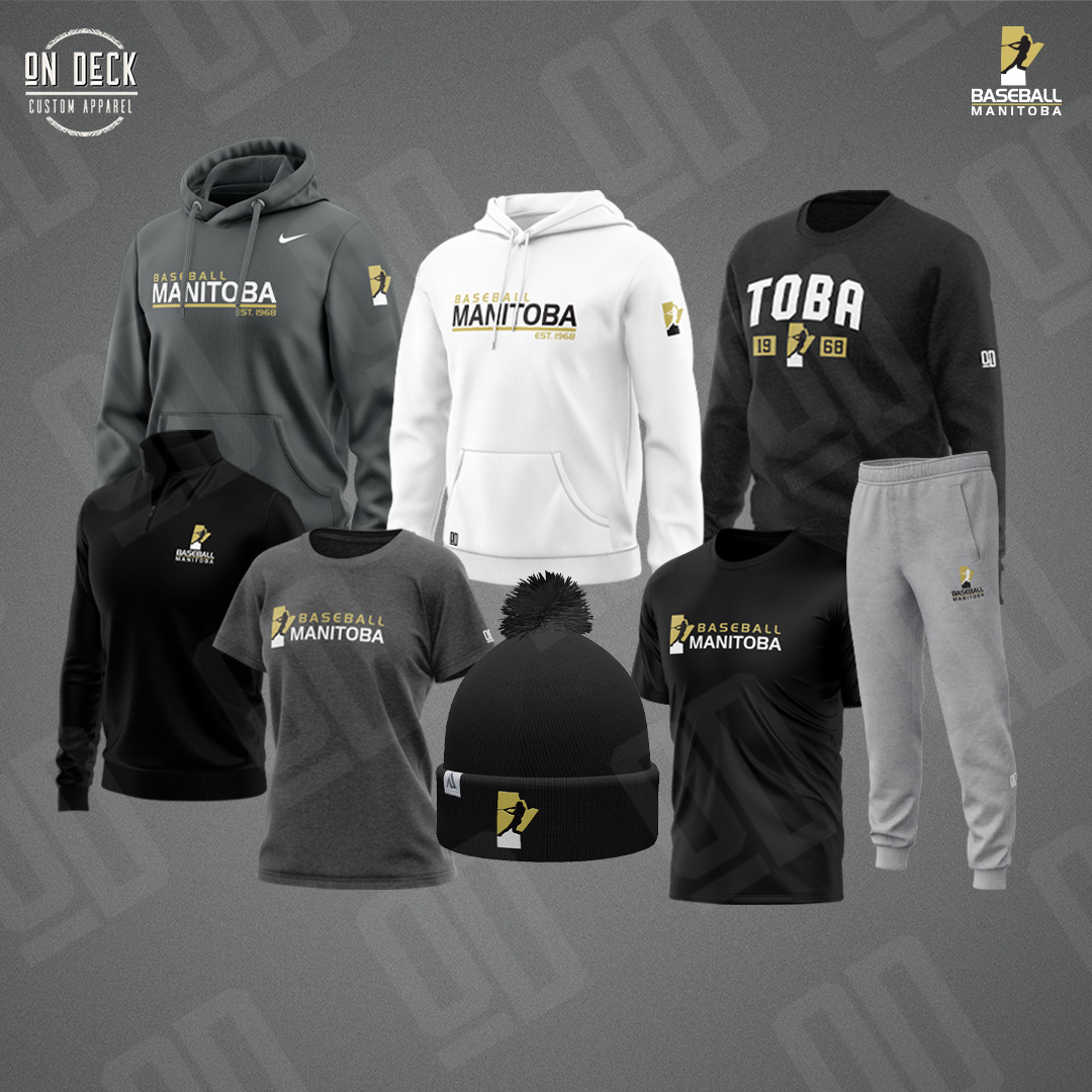 On Deck Custom Apparel has created some all-new Baseball Manitoba branded clothing designs for the 2024 winter season! The new items include joggers, toques, and sweats!