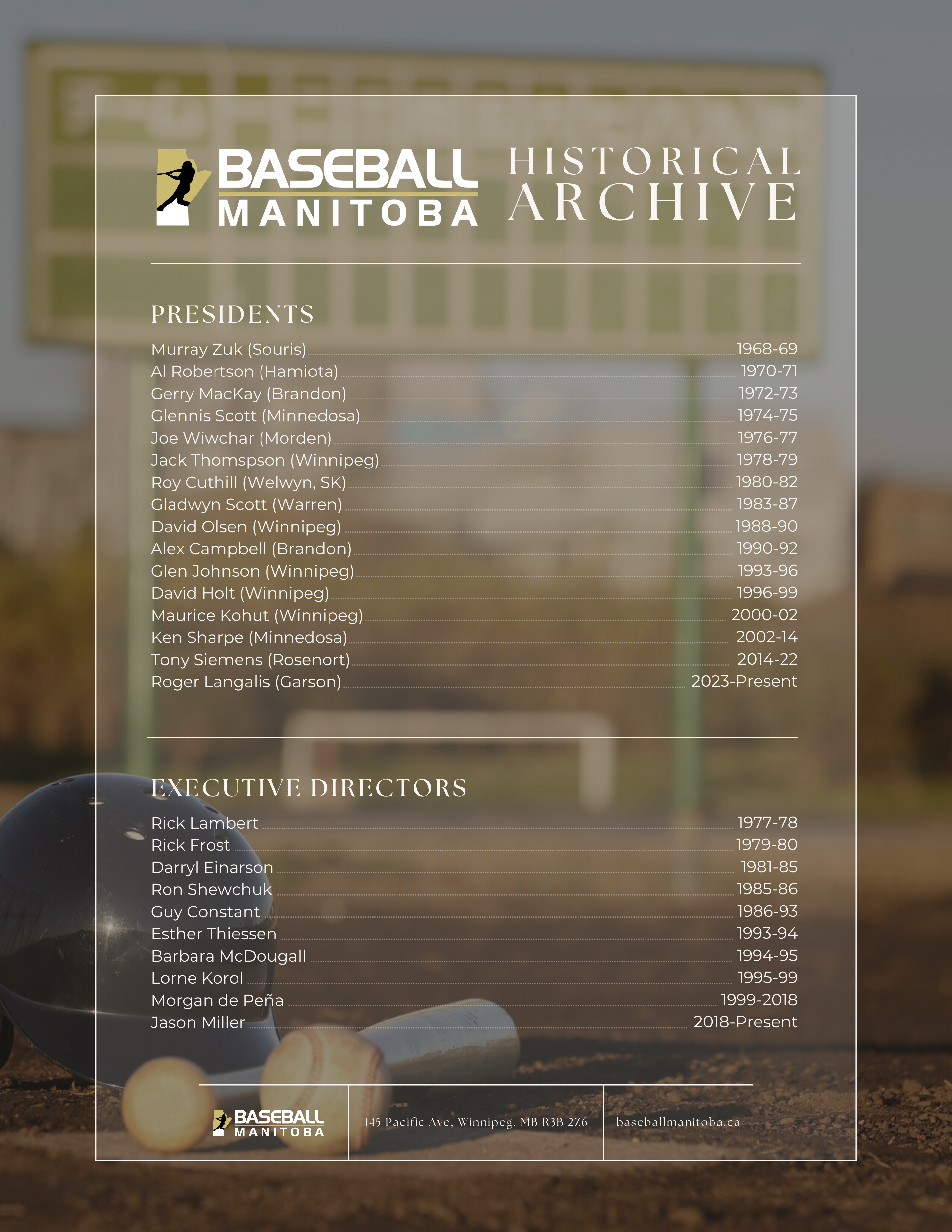 Baseball Manitoba has five office staff who coordinate and manage the day-to-day operations of the organization, which includes but is not limited to: